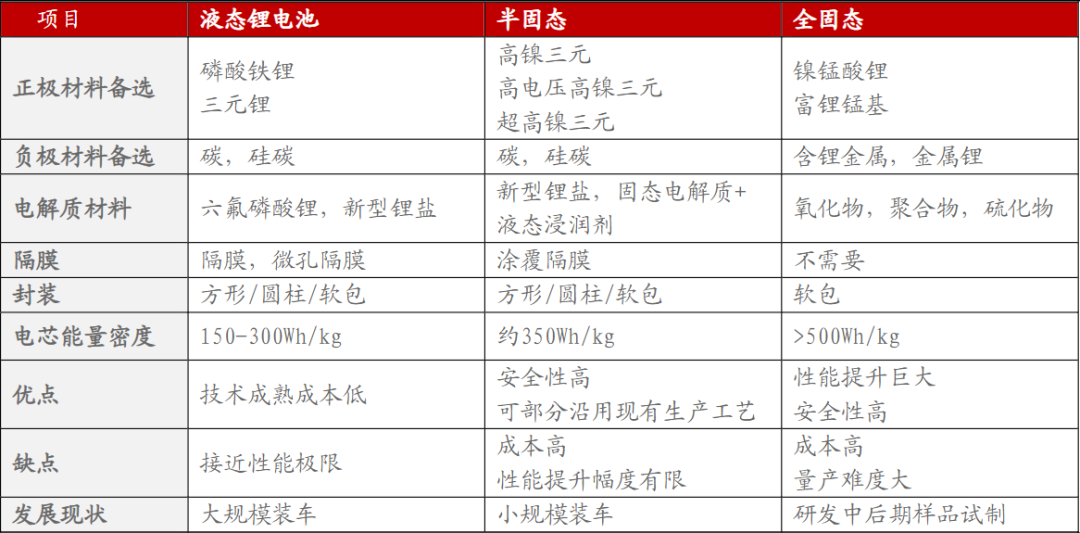 固态电解质替代电解液及隔膜。传统锂电池主要由正极材料、负极材料、隔膜和电解液四大部分组成。其中,正、负极材料决定了电池的容量,隔膜用于隔离正负极,同时允许离子通过,电解液则是连接正负极的介质,充当锂离子传输的媒介。固态电池是使用固体电解质来替代传统锂离子电池的电解液和隔膜,实现离子传输和电荷储存,是一种新型的电池技术。