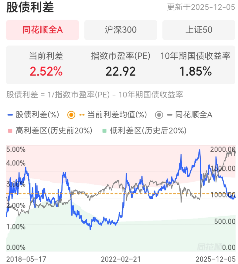 中长期看多,现阶段股债利差较大。截至12月5日同花顺全A当前的股债利差2.52%,位于高利差历史前50%区域,投资价值具备。股债利差越大,则配置股票的性价比越高,股债利差越小,则投资股票的性价比越低。当前市盈率PE22.92倍,10年期国债收益率1.85%。
